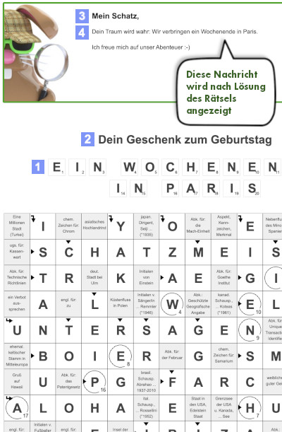 Nachdem Dein persönliches Kreuzworträtsel vom Empfänger gelöst wurde, wird ein Hinweis angezeigt. Wenn Du möchtest, kannst Du bei 3 und 4 die Überschrift und den Text für diesen Hinweis zur Lösung selbst angeben.